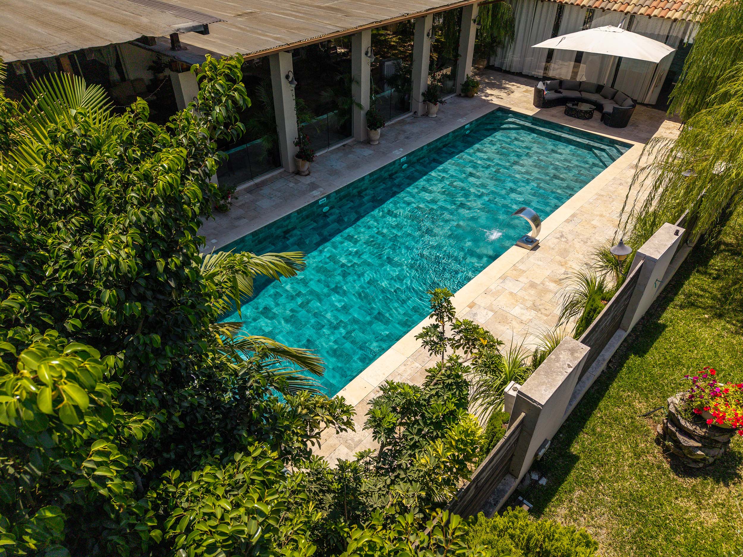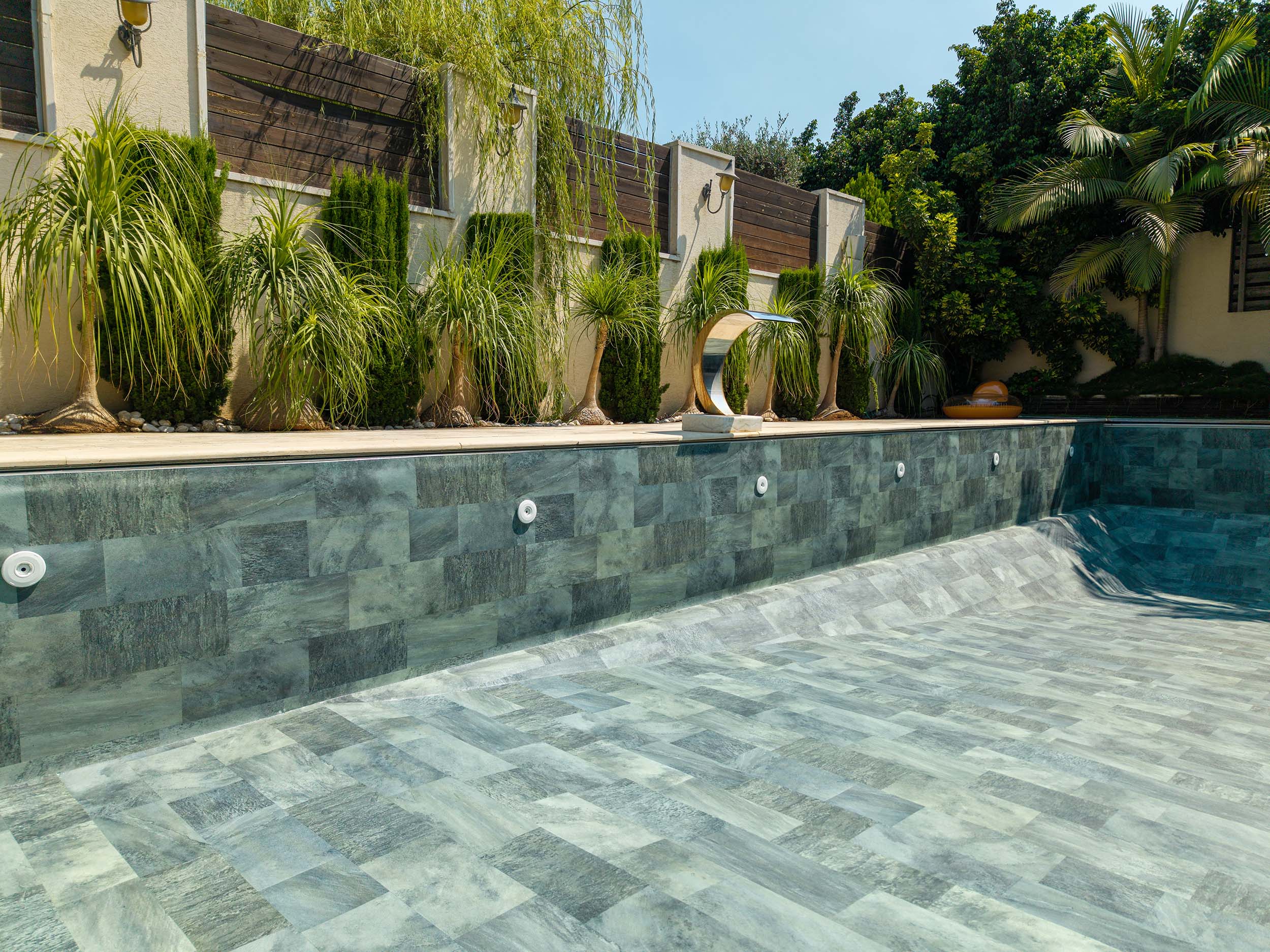აუზის მოსაპირკეთებელი ლაინერი. უმაღლესი ხარისხის ისრაელში წარმოებული აუზის ლაინერი ფილის ეფექტით. ქლორთან და მზის სხივებთან მედეგი